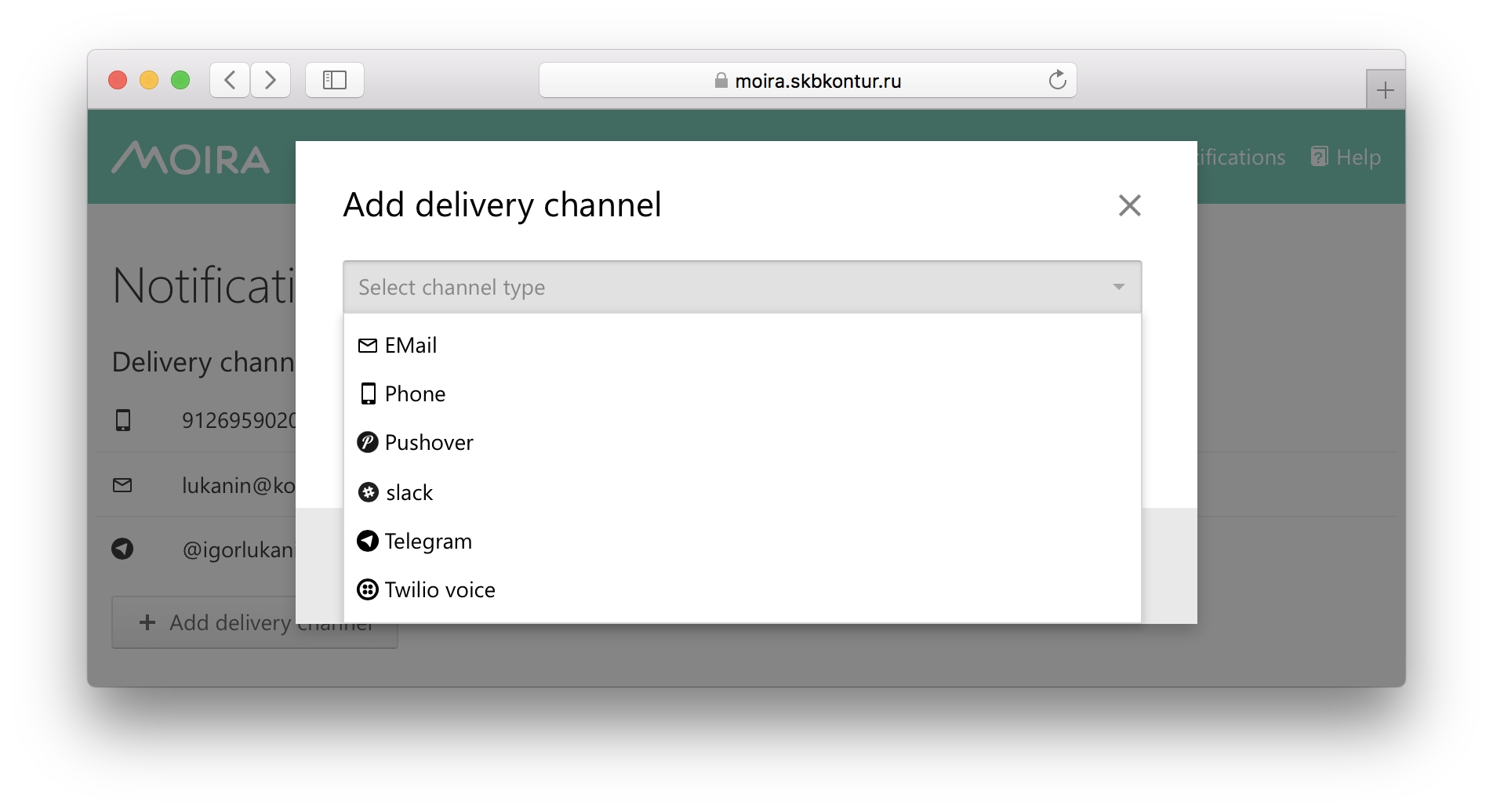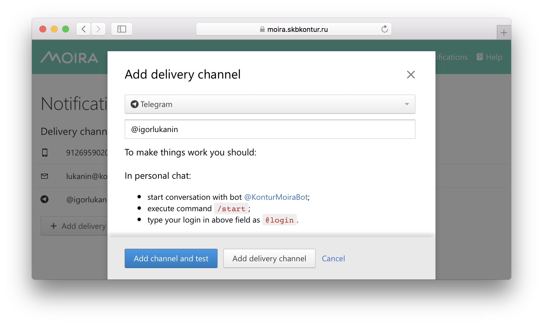 Explanation. Moira’s users are able to set up new delivery channels and contacts to be used with those channels. However Moira doesn’t check if the channel configuration is valid and alerts can be actually sent. A user may provide a non-existent Slack user name, block Moira’s bot in Telegram, etc. As a result, such user wouldn’t be able to receive alerts. The bad thing is that sometimes invalid configuration would cause Moira’s bots to be banned for a certain period of time. This effectively means a denial-of-service for alerts which is highly undesirable.