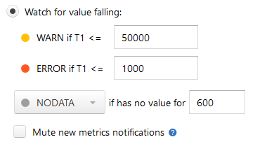 When Moira hasn’t been receiving data for more than default 600 seconds, it will set a special NODATA state for this metric. You can set any other state or change time delay here. For example, if you have an error metric, and no data means no errors, you should set this to OK.
