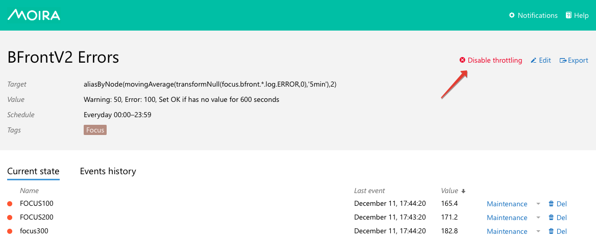Moira will enable and disable throttling automatically based on frequency of events.